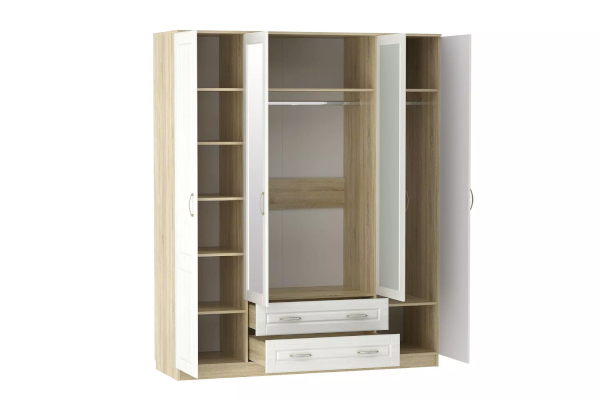 Вместительный шкаф Оливия НМ 011.84 Х поможет организовать место хранения вещей всей семьи. Шкаф имеет две секции со штангами, что позволяет рассортировать вещи по необходимым характеристикам: взрослая и детская; зимняя и летняя и т.д. Отдел с полками оптимален для размещения повседневной одежды, а два выдвижных ящика помогут раздельно хранить белье и аксессуары. Две центральных дверцы декорированы зеркалами, которые визуально увеличивают пространство комнаты и делают процесс сборов максимально удобным.