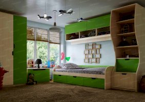 Атмосферу счастья и беззаботности приносит в дом детская «Киви». Сочетание оттенков лайм и дуб молочный выглядит очень жизнерадостно. Малышам нравится отдыхать и играть в такой комнате. Они с удовольствием спят на двух- или одноярусной кровати, хранят вещи в шкафу и на стеллажах, убирают игрушки в специальную тумбу и учат уроки за удобным письменным столом.