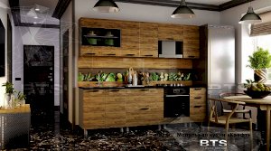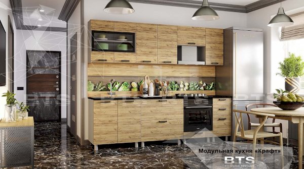 Фактурный древесный декор фасадов кухни "Крафт" отсылает к природной естественности и грации, а черные элементы создают яркие акценты, привлекающие к себе внимание. Четкие геометрические линии, массивные ручки под металл и фасады под дерево помогают отступить от стандартных шаблонов оформления кухонного пространства, обустроив у Вас дома воплощение изящества и элегантности!