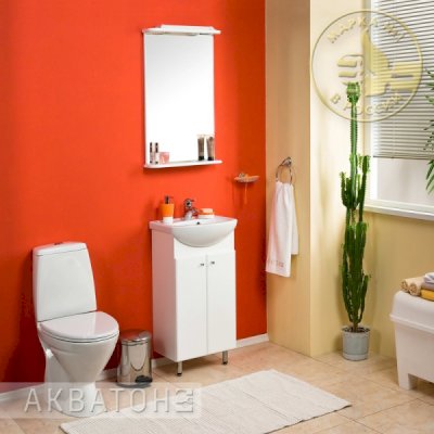 Комплект состоит из тумбы-умывальника с раковиной и зеркала с подсветкой и полкой. Несмотря на небольшие размеры, мебель обладает большими функциональными возможностями. Раковина шириной 45 см имеет удобную эргономичную форму, не выпирает, но и не даёт разбрызгиваться воде.