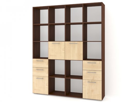 Применение задней стенки из ЛДСП (в ячейках с ящиками и фасадами) позволяет использовать данный стеллаж для зонирования пространства (чтобы предотвратить опрокидывание, необходимо обеспечить крепление стеллажа к стене).