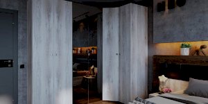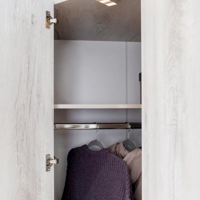 Эффективно организовать пространство в маленькой спальне поможет угловой шкаф. Стационарная штанга длиной 814 мм и полноценный стеллаж для белья внутри способствуют аккуратной организации вещей. Гладкие фасады и натуральный декор шкафа привнесут в комнату уют и теплоту. Шкаф оснащен беспроводным светодиодным светильником, который включается при открывании двери. Это особенно удобно, если нужно найти в шкафу вещи, не потревожив близких. Легкая установка на магнитное крепление не требует дополнительного сверления, прокладывания провода, подключения к сети. Регулируемые опоры компенсируют неровности пола. Шкаф необходимо обязательно крепить к стене на подвесы!